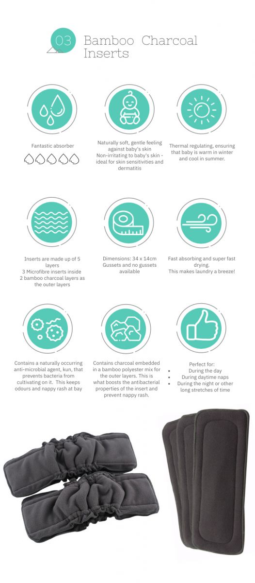- Bamboo: Great absorber and is soft on baby’s skin. For more features on bamboo fibre please check out the description here. The difference between White bamboo and bamboo charcoal inserts is that bamboo charcoal contains charcoal embedded in a bamboo polyester mix for the outer layers, which boosts the antibacterial properties of the insert and prevent nappy rash. Bamboo is also a fast absorber.