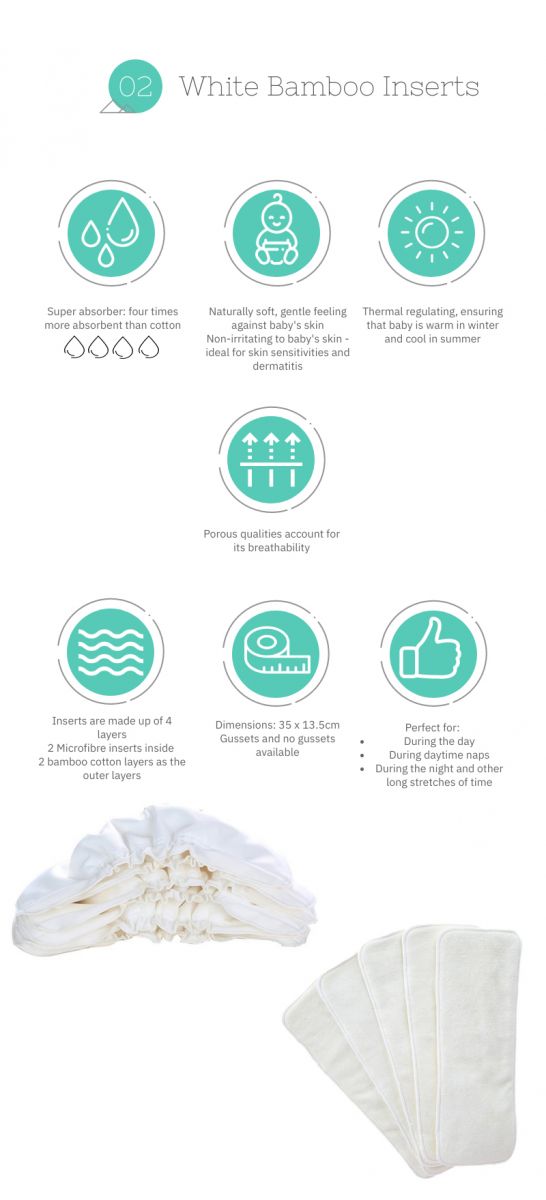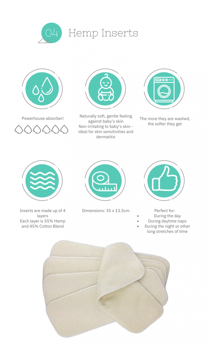 It is advisable to try a variety of materials in order to see what works for your baby. Usually, newborns don’t need that much absorption, so you might find that one microfibre or bamboo insert is doing the trick. As baby gets older, starts eating solids, is sleeping through the night or having long naps, you’ll need to try the more absorbent options like bamboo or hemp. Our cloth nappies are pocket nappies, so more than one insert can be placed in the pocket of the nappy to maximise absorption when your child reaches this stage. If you’re still uncertain and want some advice related to your situation, please feel free to contact us.