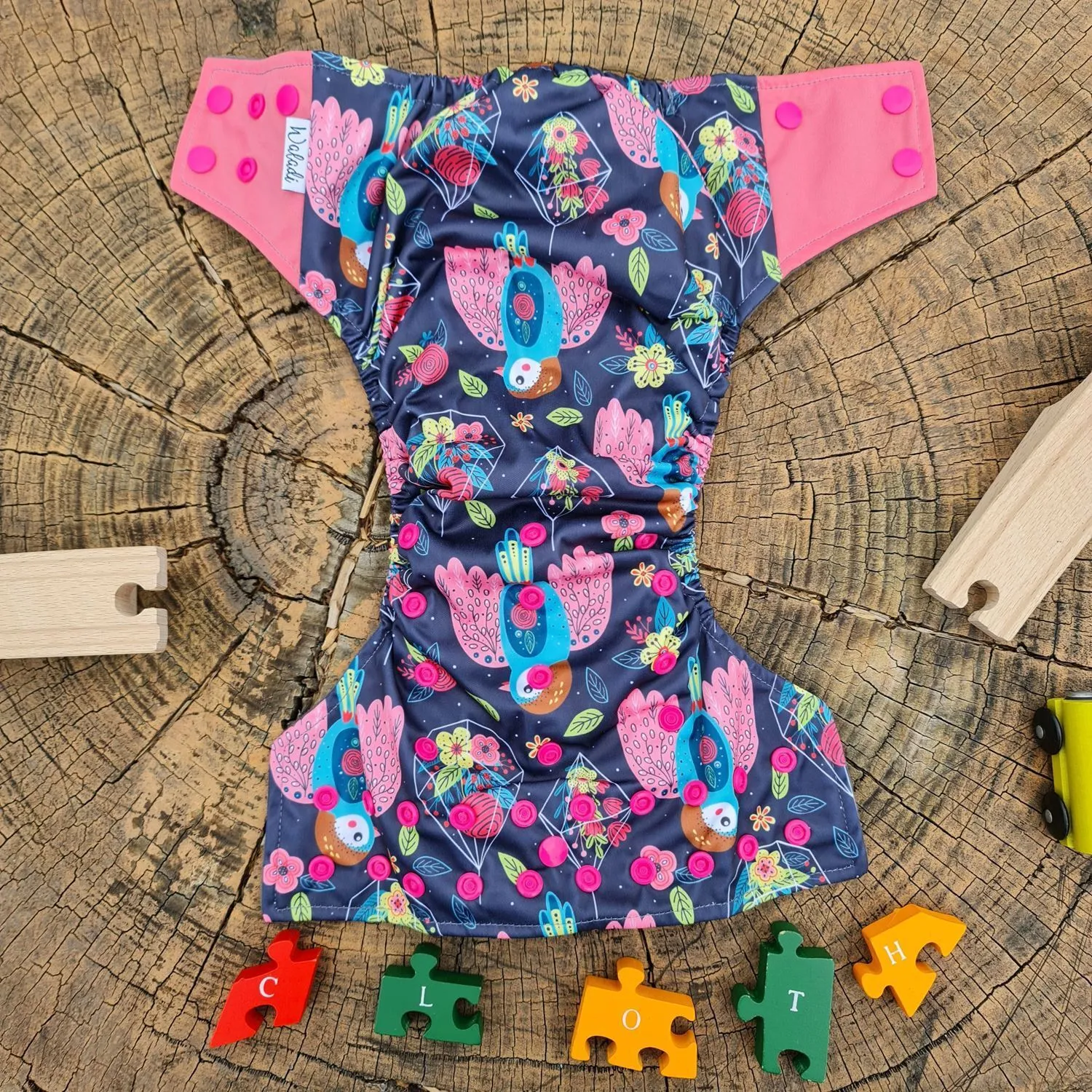 I’m really impressed with this nappy. I’ve been trialing different nappies and this is one of the best so far. Really liked the fit of this nappy. Easy to get a good fit and no leaks so far. Great design. Love the double gussets – they help to hold things in. Not sure why more MCNs don’t have this. The extra row of rise snaps makes sizing easier. Great quality. Also love the colours of the sea horse design. Thanks Waladi!