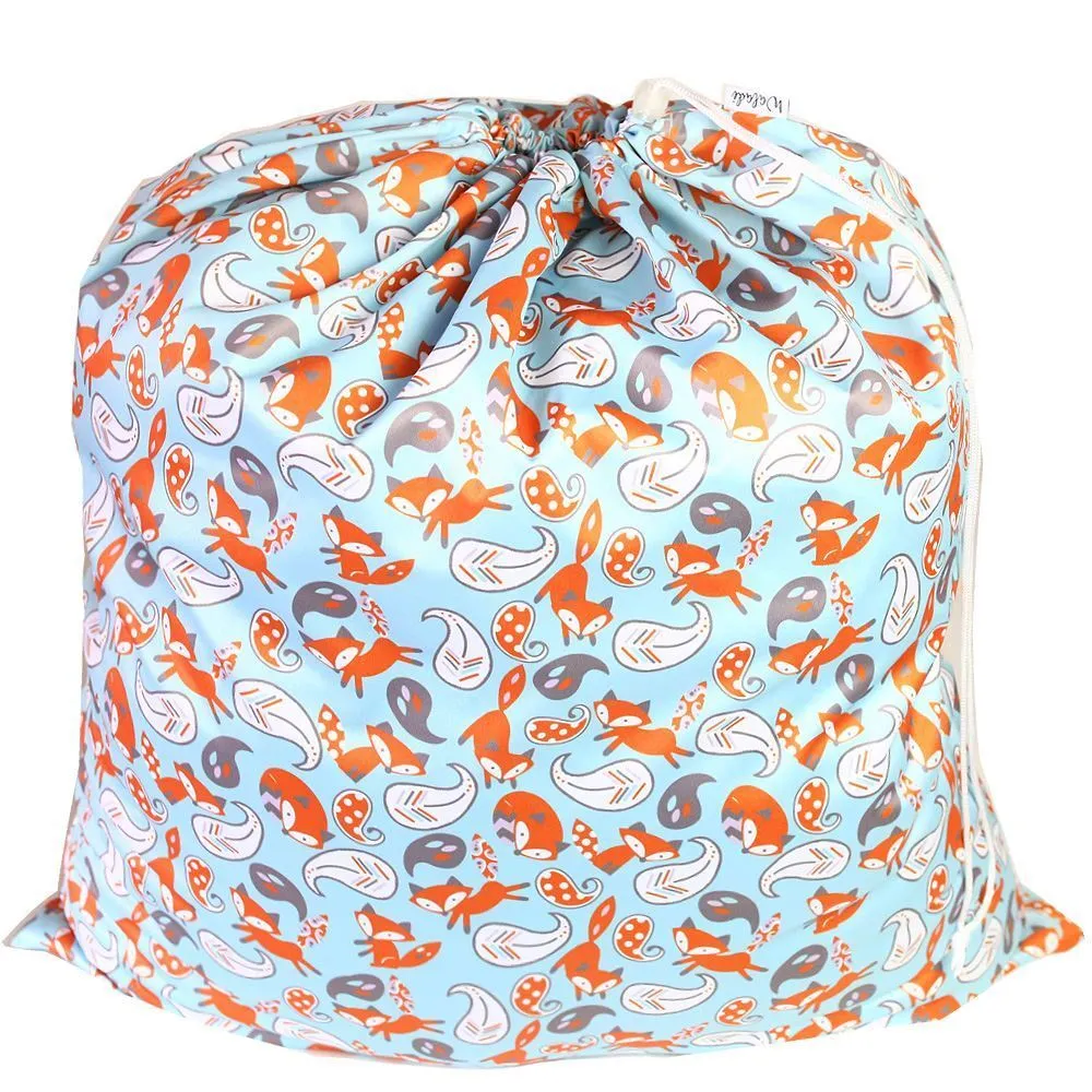 A wet bag is essential for any parent’s arsenal. Some parents use it solely as a diaper bag! It holds soiled clothing, cloth diapers, wet swimsuits, toys, wet wipes, snacks, sippy cups, bottles, toiletries, potting training supplies…the possibilities are endless! Our wet bags are machine washable and dryer safe. We recommend low settings for both.
