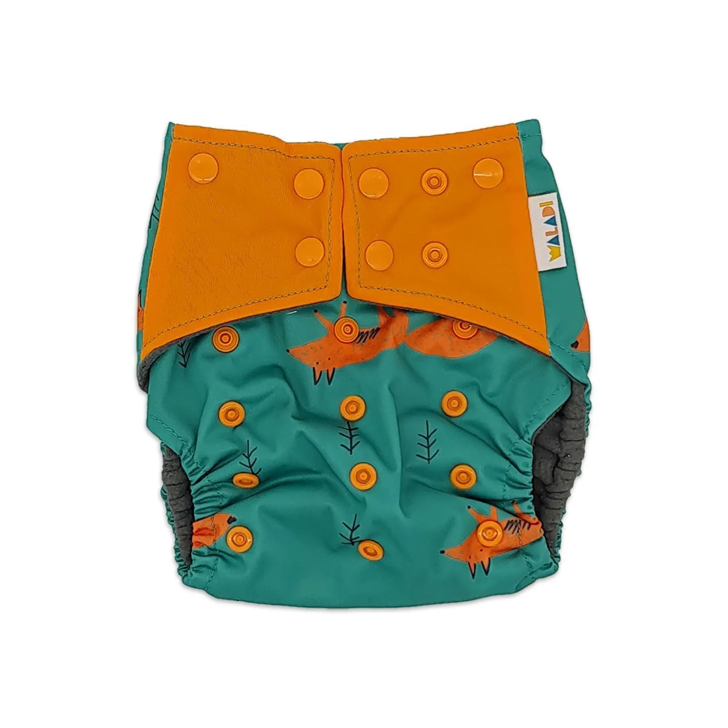 I’m really impressed with this nappy. I’ve been trialing different nappies and this is one of the best so far. Really liked the fit of this nappy. Easy to get a good fit and no leaks so far. Great design. Love the double gussets – they help to hold things in. Not sure why more MCNs don’t have this. The extra row of rise snaps makes sizing easier. Great quality. Also love the colours of the sea horse design. Thanks Waladi!