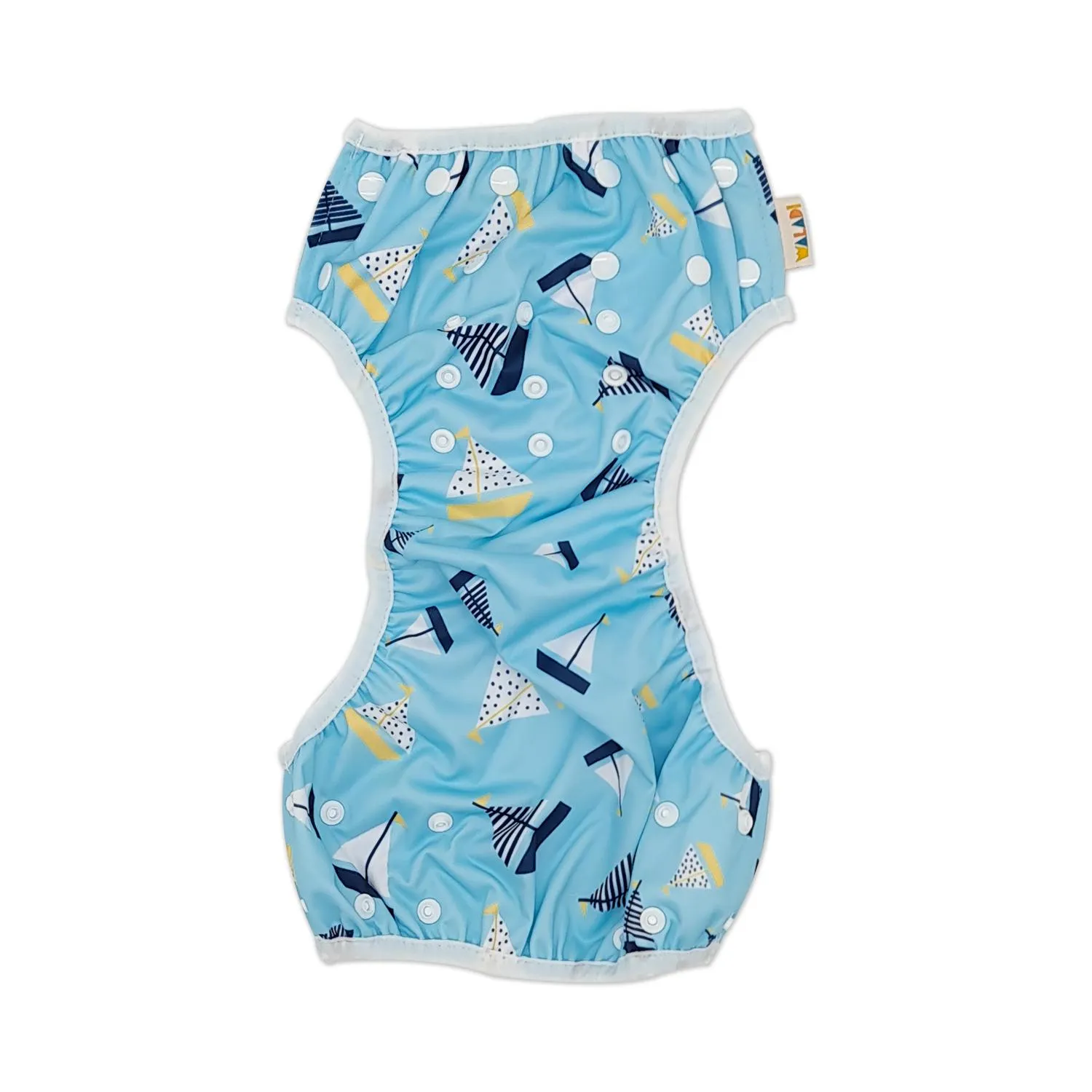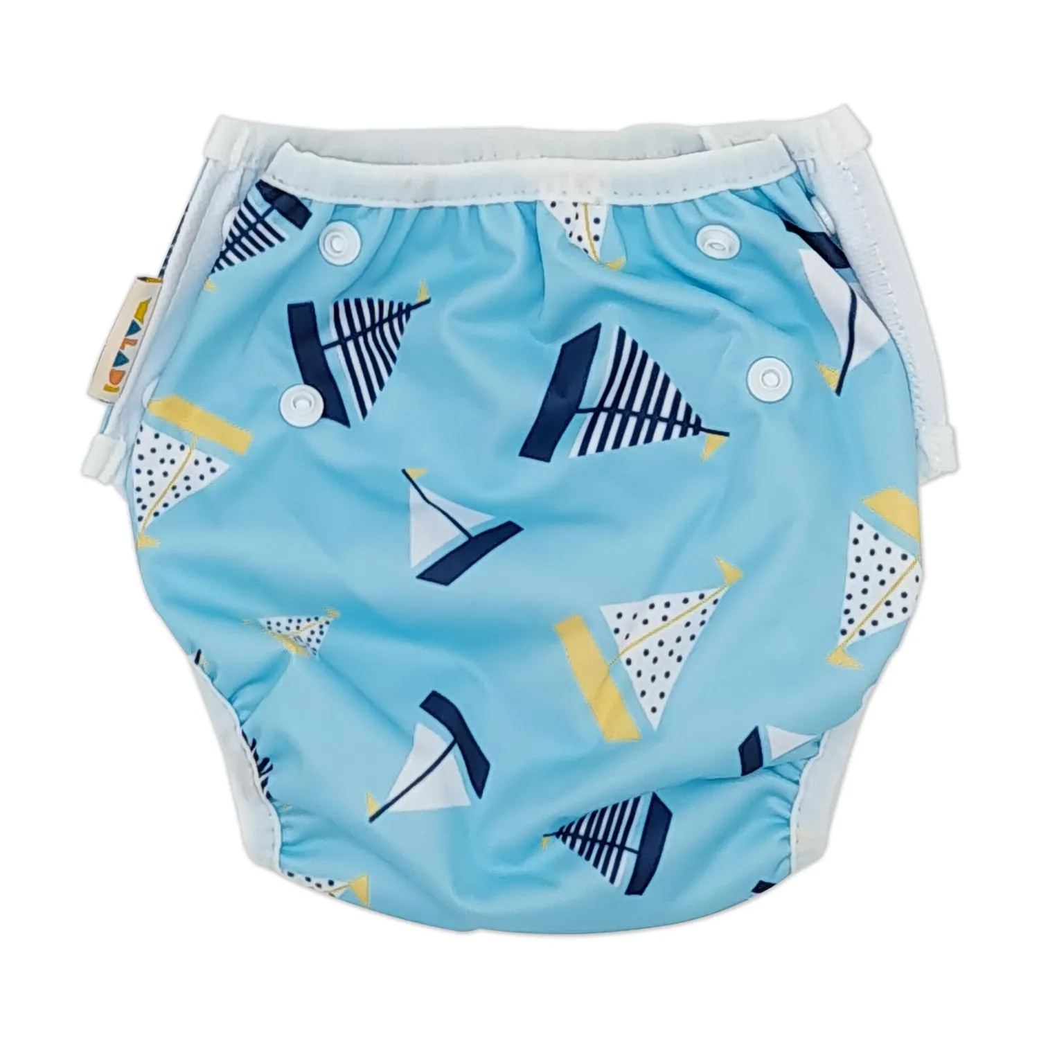 - Has a built in system of snaps to easily adjust the size across the waistband as well as the length of the swim nappy.
