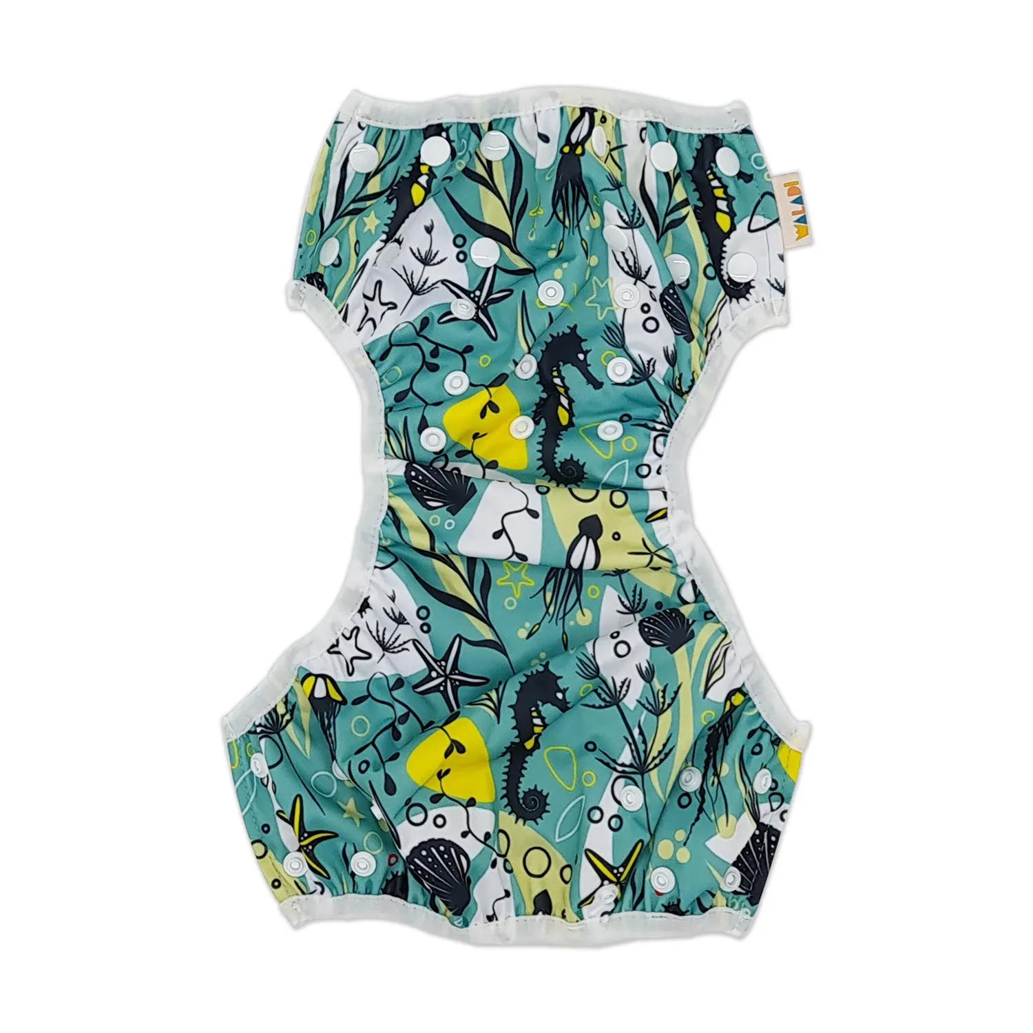 • Has a built-in system of snaps to easily adjust the size across the waistband as well as the length of the swim nappy.
