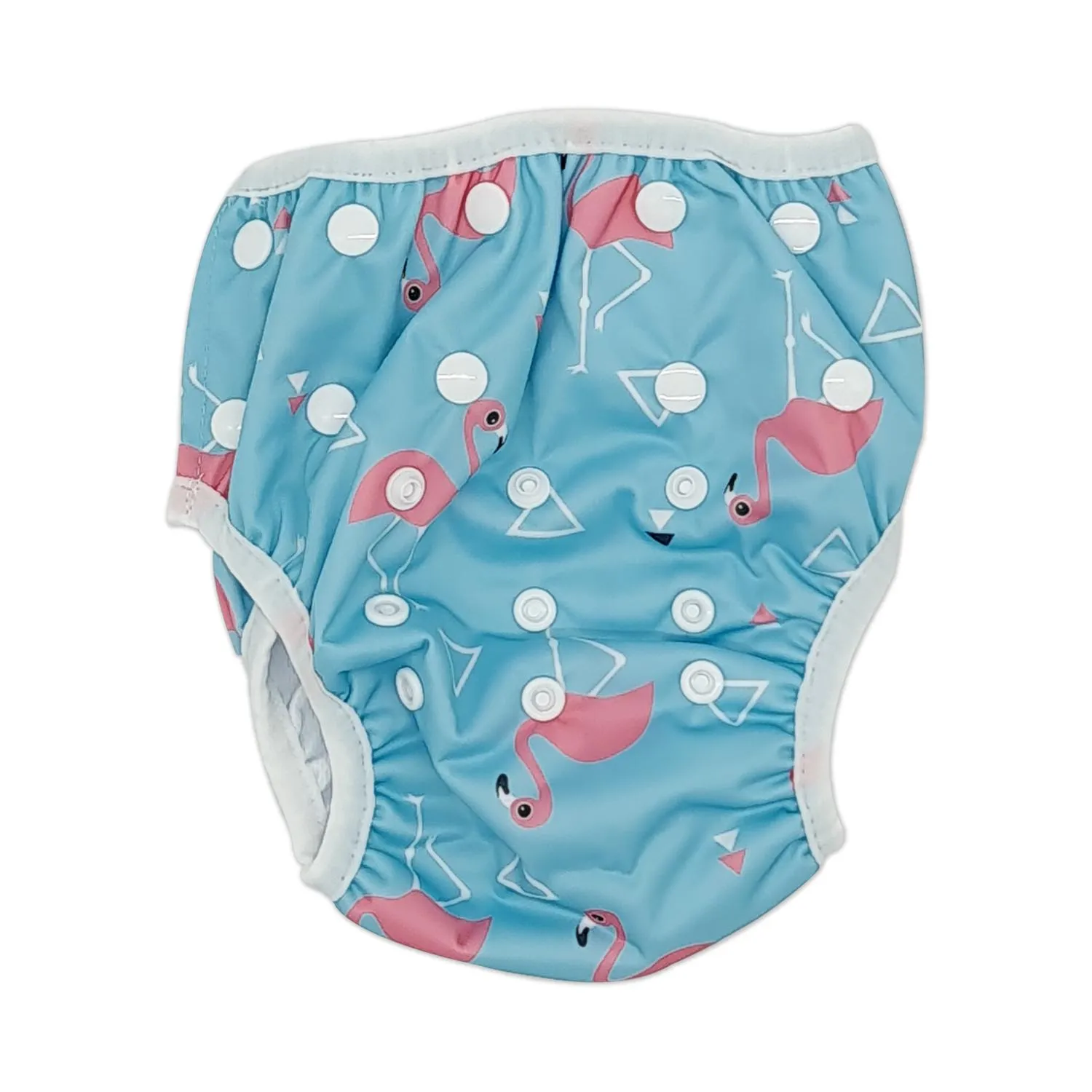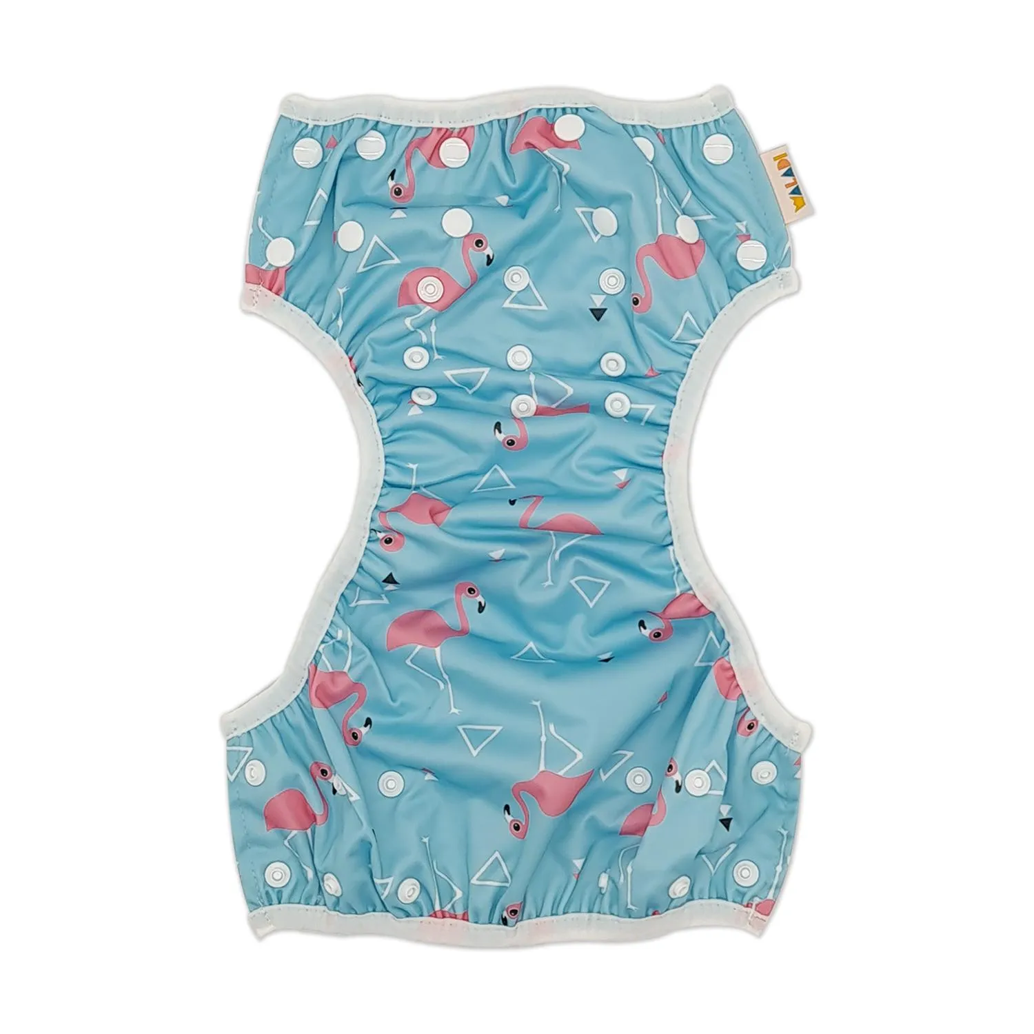 - Has a built in system of snaps to easily adjust the size across the waistband as well as the length of the swim nappy.