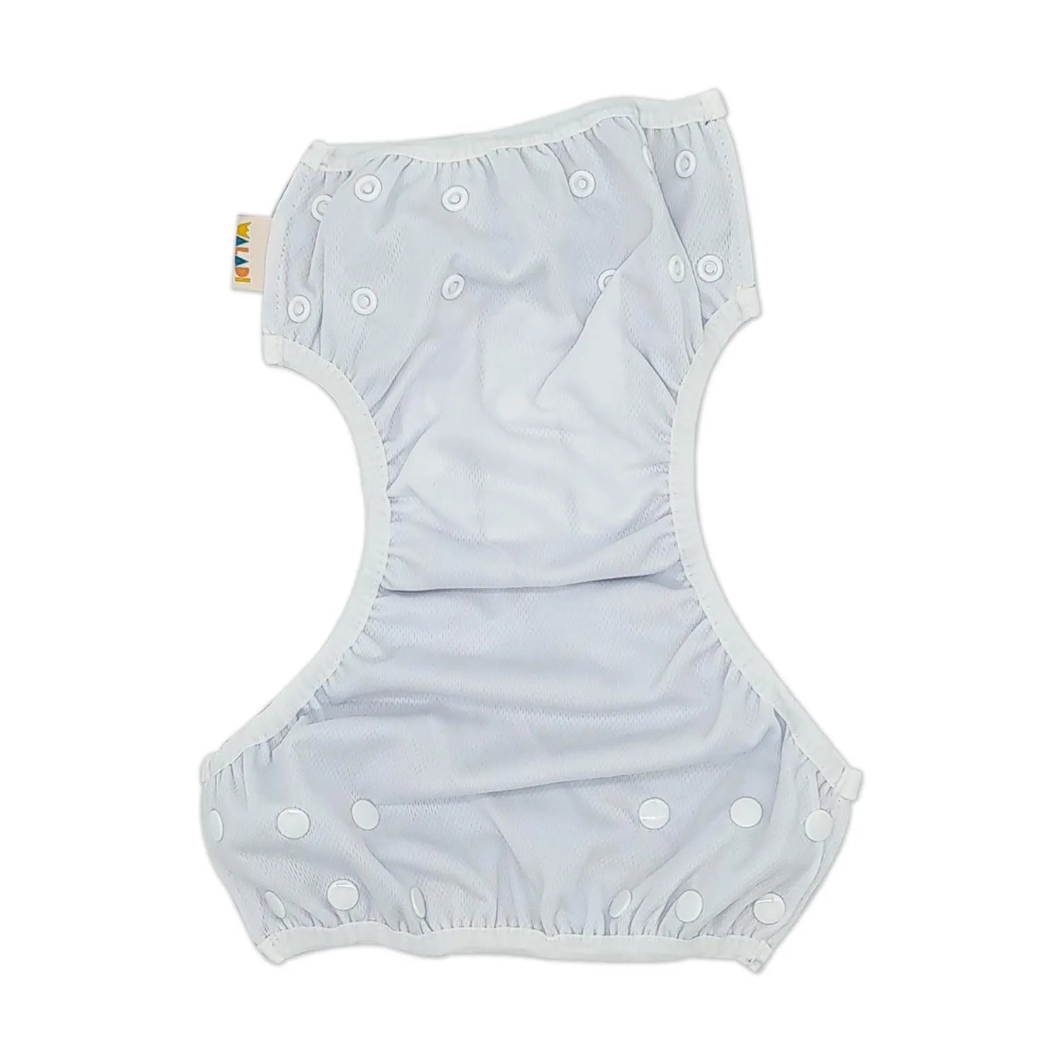 • Has a built in system of snaps to easily adjust the size across the waistband as well as the length of the swim nappy.