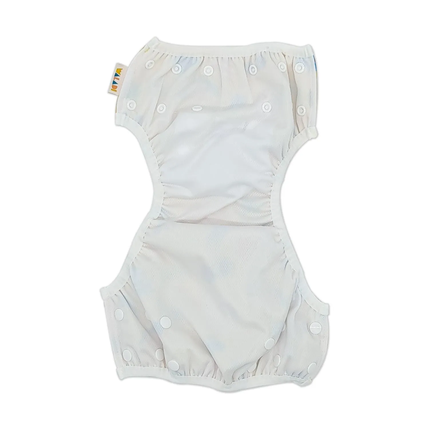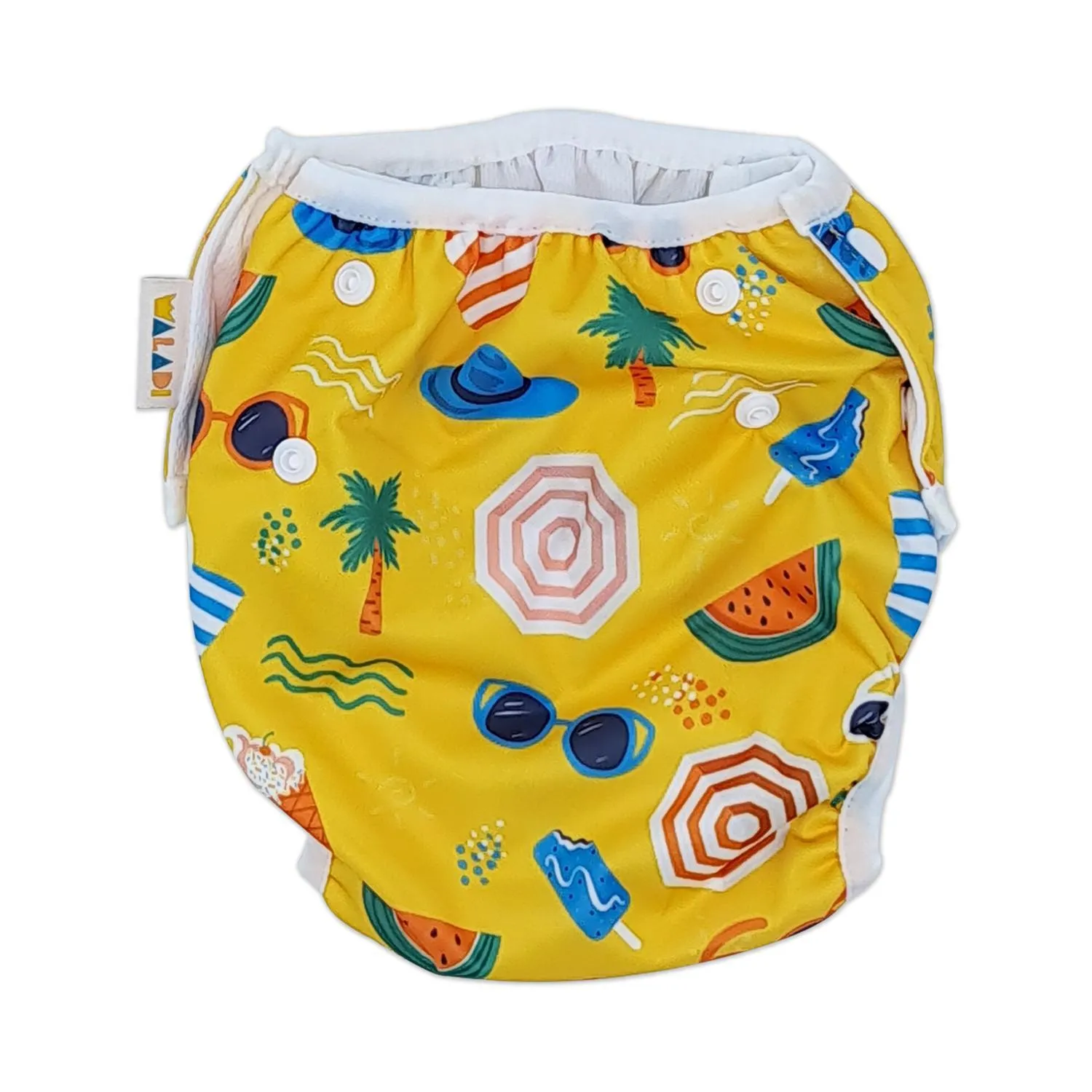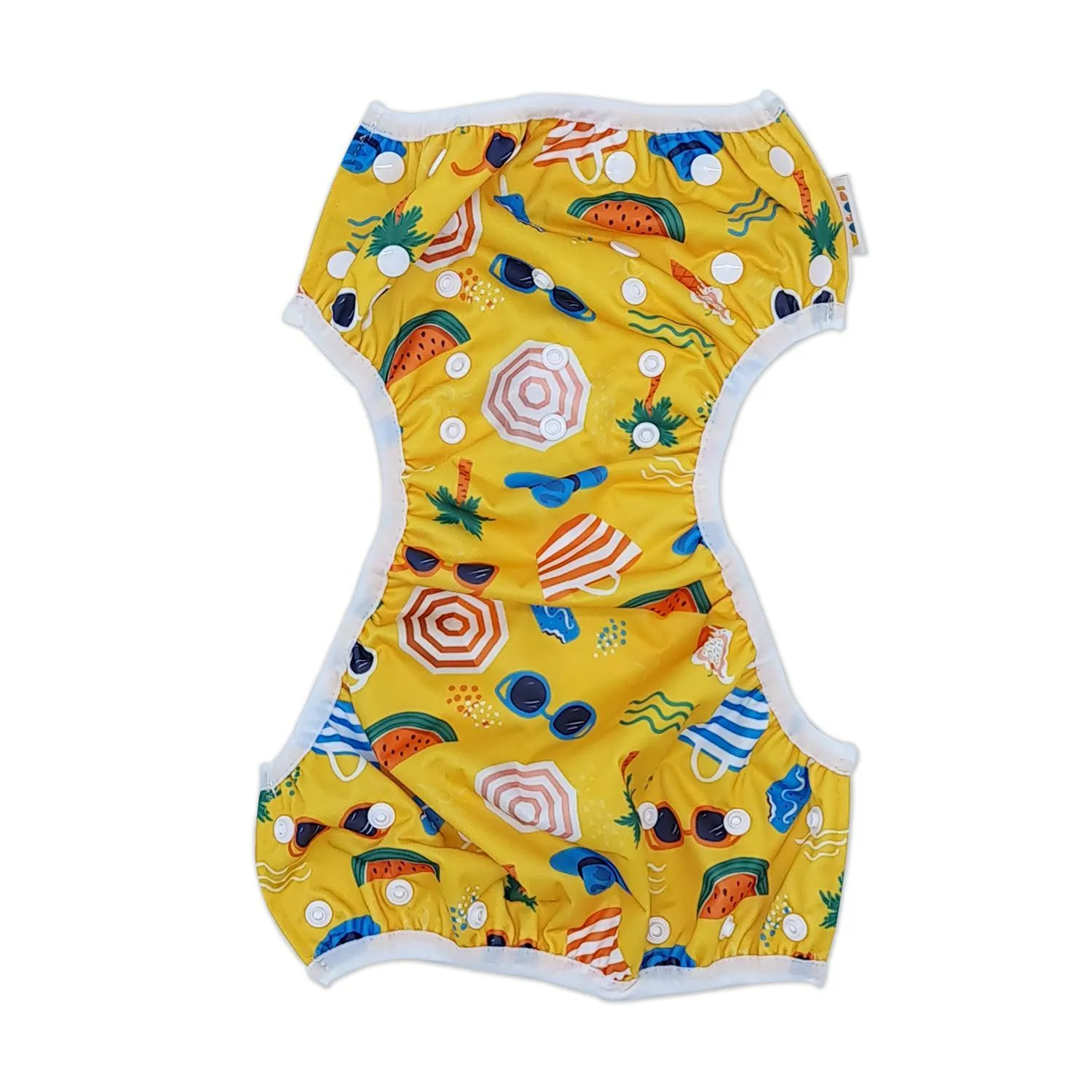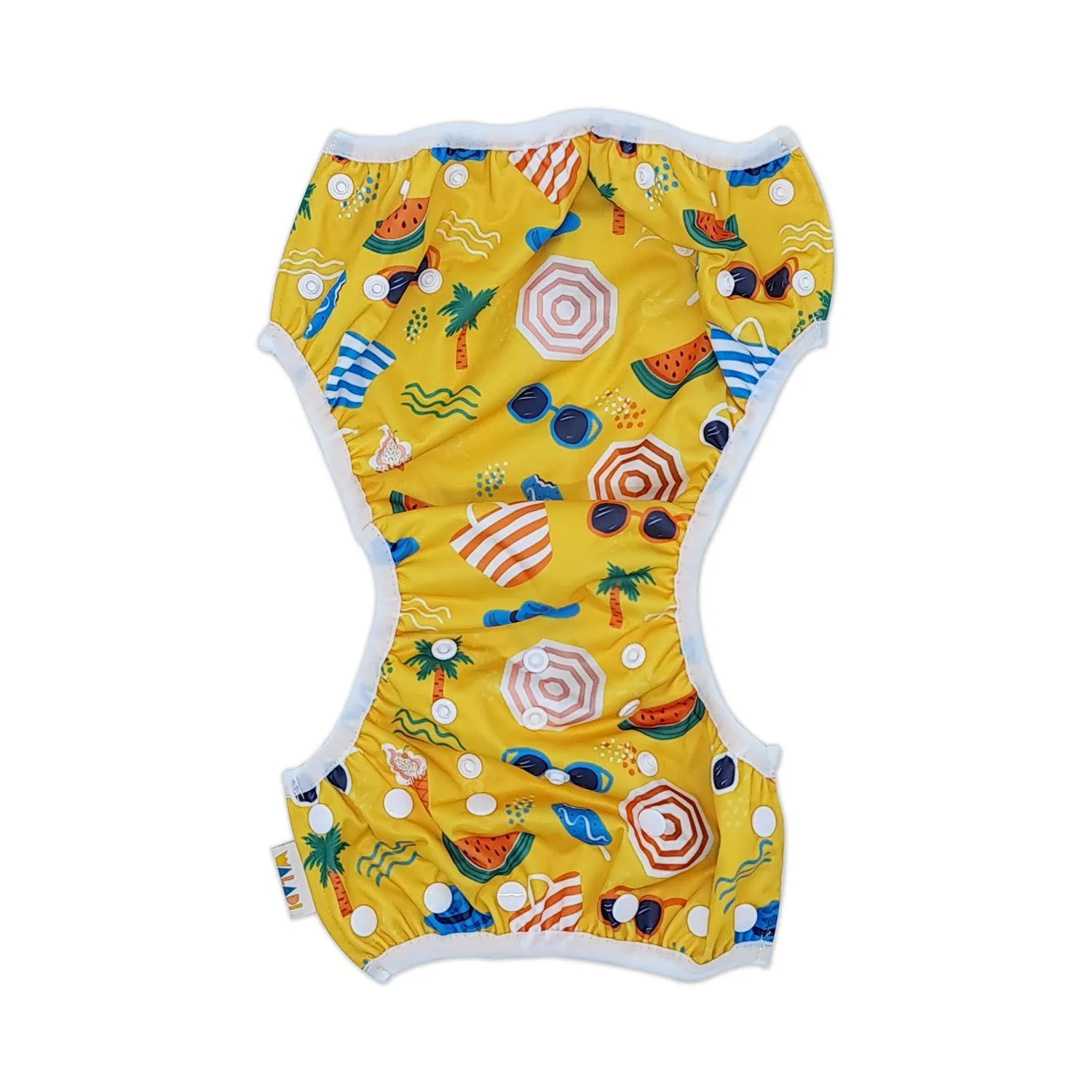 - Has a built in system of snaps to easily adjust the size across the waistband as well as the length of the swim nappy.